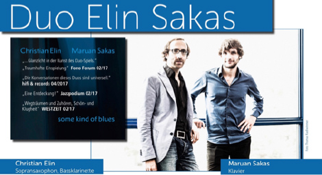 Mit Christian Elin und Maruan Sakas haben sich zwei Grenzgänger zu einem besonderen Duo zusammengetan: Beide Musiker sind sowohl im Jazz als auch in der Klassik zu Hause und diese Liebe zur Freiheit der Improvisation sowie zur Klarheit der klassischen Form drückt sich auch in ihren Kompositionen aus: Im Spannungsfeld von Jazz, Minimal Music, Filmmusik und ethnischen Anklängen stehend, zeichnet das Duo Elin-Sakas in seinem Debütprogramm »Some kind of Blues« mit viel Sinn für Klangschönheit eine schlichte und tiefgehende Musik, deren klanglicher Reiz durch die Vielfalt von Elins Instrumentarium - von den tiefen, dunklen Tönen der Bassklarinette bis hin zum strahlenden Sopransaxophon – noch intensiviert wird.